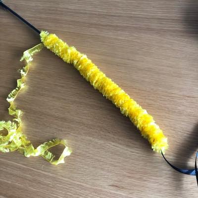最初にストローにリボンを通しておいて、ストローにヤーンをくるくると巻きつけ、キュッと寄せていきます。塊が長くなってきたら、ストローから外していきます。