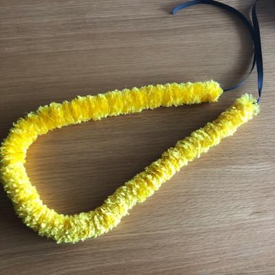神話でハワイ島パリウリにある黄色の羽で出来た家に住んでいたという、ライエイカヴァイについての曲なので、羽らしく見えるヤーンレイを作成中です。