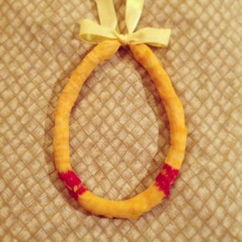使った材料は、ウルヴェヒヤーンエルアというヤーン(1玉でレイ一つ出来ました)、リボンとククイナッツ。そして、道具はリボン通しとヤーンを巻きつけていくストロー。リボンレイ用の硬いストローです。